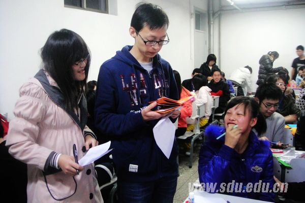 经过一小时的忙碌,选手们完成了自己的作品。作品风格迥异,有饰以羽毛的温暖型,有小清新的编织风,有造型独特的活动蝴蝶,亦有体现童真童趣的卡通版。这些作品均为选手们亲自动手,发挥想象力与创造力,围绕“感恩”这一主题合作完成的,简约大方的设计中又不失精致的细节,色彩混搭中又不流于俗套。评委们对选手们的作品进行参观和了解,并就作品的美观度和创意性进行了细致的评分。最后张悦与孙嘉瞳一组的清新编制篮贺卡在众多参赛作品中脱颖而出,草编风格和清新淡雅的色彩让人眼前一亮,而篮中红色卡纸上的祝福辞又让人感受到感恩节里独特的温暖气息。