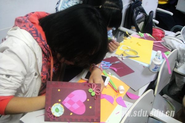 在主持人向大家介绍了感恩节的来历和习俗之后,贺卡制作大赛正式开始。选手以小组形式参加比赛,要在一个小时之内,利用一张卡纸和彩笔、剪刀等基本工具制作出一个以“感恩”为主题的贺卡。计时一开始,参赛选手们就投入了紧张的比赛中,剪纸、粘贴、绘图、上色,选手们是一刻也没闲着。简简单单的彩纸在同学们的巧手中幻化为一朵朵娇艳欲滴的玫瑰、纯洁的雪绒花和一只只展翅欲飞的纸鹤。而色彩单一的卡纸在选手们彩笔的描绘下,呈现出各色图案,令人眼花缭乱。