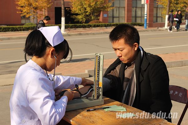 活动伊始,护理技能协会的同学们身穿护士服,打开血压计,为同学们测量血压。与此同时,材料学院青志协的同学们积极发放有关健康小常识的宣传单并讲解这次活动的意义,一时间空旷的餐厅门前热闹起来。