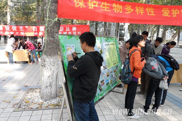 在班长和团支书的带领下,同学们提前到达场地开始进行安排布置,挂横幅、布置展板、搬桌椅有条不紊地展开。活动以分发生物多样性知识宣传单、进行生物多样性知识讲解和有奖答题的形式开展。负责分发宣传单的同学热情地向过往人群介绍本次活动,积极回答同学们提出的各种问题;在展板处负责讲解的同学着重介绍生物多样性的现状及正在面临的挑战和威胁,当看到展板上被杀害的动物照片时,同学们表现出了强烈的同情心和社会责任感,并在留言板上了留下了自己对生物多样性现状的看法;活动现场最受大家欢迎的就是有奖答题环节,尽管很多同学不是生物科学专业,但这丝毫不会影响他们对生物知识的追求,很多同学小试牛刀就拿走了精美的书签、签字笔、记事本等精美的礼品,同学们纷纷表示这样的活动让他们在获得快乐的同时也收获了知识,是很好的尝试。