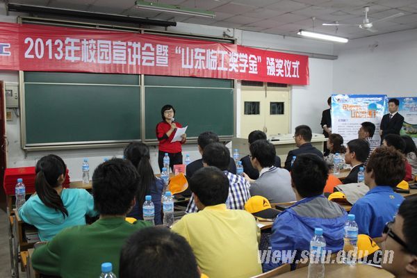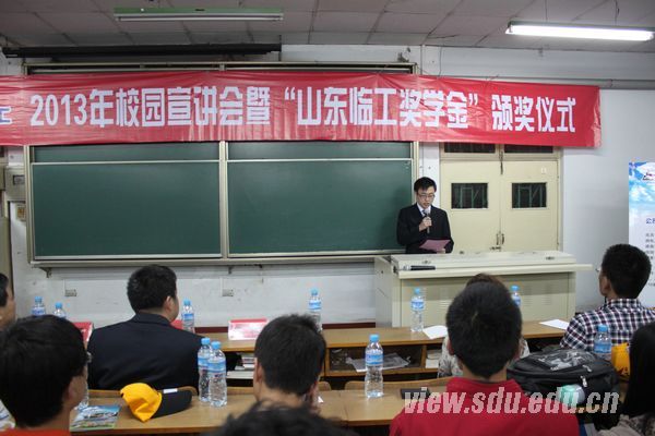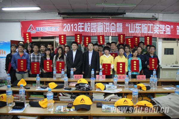 [本站讯]10月12日,第三届山东临工奖学金颁奖仪式暨2013年临工校园招聘宣讲会在千佛山校区举行。机械学院副院长王勇,山东临工集团总经理助理迟峰、人力资源部经理王柯出席了颁奖仪式。会议由机械学院团委书记朱征军主持。本年度临工奖学金获得者和部分09级同学参加了此次会议。