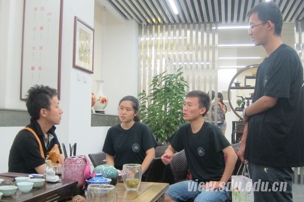 下午三时,团队来到山东大学中华传统文化研究与体验基地开展茶文化的调研,恰逢日本大东文化大学师生在此进行中华传统文化的体验。队员们与大东文化大学师生共同了解了茶道六君子:茶匙、茶针、茶夹、茶则、茶海、茶筒,并观看了茶道表演:西湖龙井、黄山毛峰与大红袍的不同泡制步骤。表演结束,队员们与大东文化大学师生开展茶文化交流,共同探讨了中日茶道异同、日本茶道普及程度等问题。大东文化大学教授吉田笃志还讲到,日本茶道源于中国并深受禅宗思想影响,大约在元朝时茶道与日本本土文化相结合,才逐渐形成了现在的日本茶道。交流结束日本师生主动与我们合影留念。
