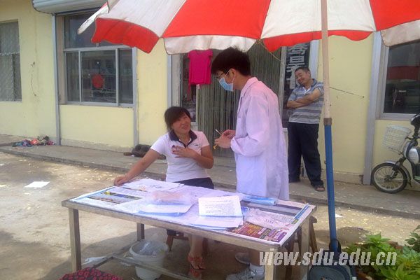 沂水支队由口腔医学院学生杨晓丽、赵波等组成。上午,团队在圈里镇集合完毕,简单交流后迅速展开工作。展台、桌布、遮阳伞、宣传册、问卷等一一布置开来,不一会儿便有乡亲过来询问。义诊过程中,队员交替进行填表和检查工作,在保证了工作新鲜度的同时让每个人得到实践的机会。工作时遇到不识字的老人,队员耐心地进行询问调查,传达正确的口腔保健方法,并仔细检查老人的牙齿状况,提出可行的建议。下午烈阳高照,路上行人减少,团队采取走访的方式进入居民家中调查,虽效率不高,但收获尚可。