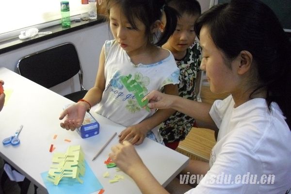 然后,队员们开始教孩子折纸。志愿者们拿着彩色美术纸,叠成四折,画上标记,沿着标记撕开纸片,一个双喜字就展现在孩子们面前。小朋友们迫不及待地动手做起来,一些小朋友遇到困难,志愿者们就手把手地教他们,最后都完成了各种颜色的喜字。激动的小朋友们有的把喜字摊在桌上,有的把喜字骄傲地举在头上,有的贴在脸上。之后,志愿者们继续教小朋友们叠兔子和青蛙。折叠工序完成后,一口气一吹一个生动活泼的小兔子就活灵活现地展现在面前;一折一叠之间,青蛙便在桌子上跳跃起来。