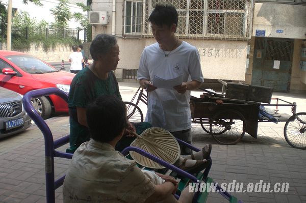 [本站讯]山东大学“民生”调研团队关注于城市居民生活质量问题,从历下区小范围、小角度切入,团队依托社区开展各项活动,采取问卷调查与采访宣传相结合的调研方式,对出入小区的居民采集资料。