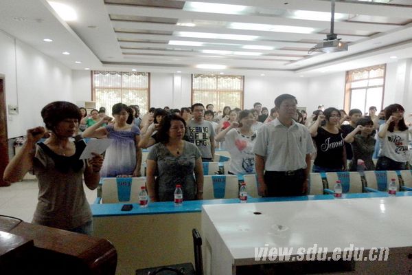 [本站讯]6月15日下午,外语学院举行2011-2012学年新党员入党宣誓大会。外语学院党委书记郑倩、党委副书记曾志英出席大会,大会由学院党委副书记高弟主持。