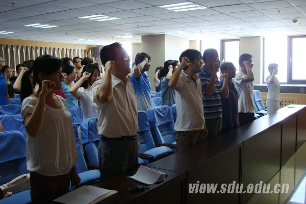 大会在雄壮的《国际歌》中开始。在领誓人胡璞心同学的带领下,全体新党员面向党旗,举拳庄严宣誓,郑重地表达为共产主义事业奋斗终生的决心。宣誓完毕,新党员代表赵彧同学发言,表达了对党组织的热爱与向往和为人民服务的坚定意愿,体现出努力进取、积极向上的良好道德情操;同时,他还代表全体新党员向组织庄严承诺,既要加强政治理论修养、提高政治觉悟,又要注重提高自己的业务水平和专业素质,将所学知识运用到社会主义建设的伟大实践中去。研究生方垒同学代表老党员发言,对新加入组织的党员同志表示祝贺与热烈欢迎,勉励新党员走有意义的道路,做有意义的事,过有意义的生活,从为人民服务中找到快乐和人生的价值;同时,她表示作为党员应该坚定共产主义信仰,时刻谨记自己作为党员和山大人的身份,充分发挥党员的先锋模范作用,不断创新,锐意进取,为党和人民的事业做出更大贡献。