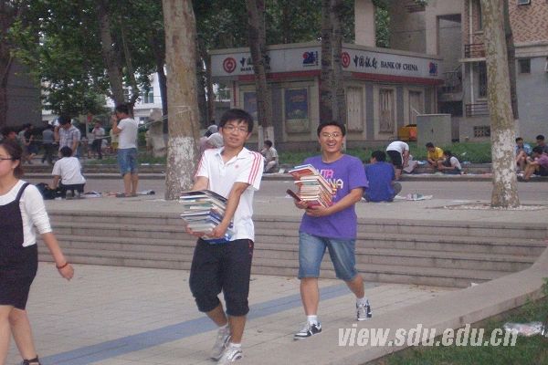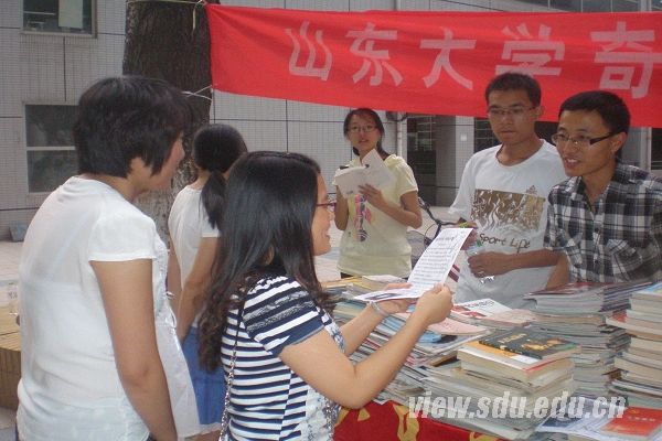 清早,奇迹风帆的队友们来到中心校区餐厅东南门。队长张荣华组织大家挂上横幅,布置好现场。队员们按照事先的分工,深入到跳蚤市场中分发活动传单,开始宣传“捐书献爱心”活动。各位摊主同学听到要捐书给贫困农村的孩子们,都十分积极地配合,主动把《青年文摘》、《疯狂英语》之类的杂志以及一些文学类读物捐献出来。随着时间的推移,越来越多的同学主动将书及其他衣物送到宣传地点,有一位同学恳切地对队员们说:“这些适合孩子们读的书,可以直接给他们带过去;不合适的书可以卖掉,再买新的书送给孩子们。希望我们的书能对孩子们有所帮助。”听了这番话,队员们都很感动,在向这位同学表达感谢的同时也并表示会将这份心意转达给孩子们。