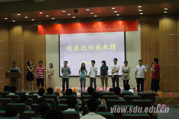 活动开始,“山东大学十大歌手”一等奖获得者梅林为大家献唱一首歌曲《爱的就是你》,悠扬的歌声,动人的旋律感染了在场所有观众。在温馨的氛围中,主持人组织观众进行了第一个互动环节“你来比划我来猜”。十名观众上台,男女插空站成一排,然后依次通过肢体语言来解释给定的成语,最后由第十名观众猜出这个成语。趵突泉校区的研究生们开始比较拘谨,而来自千佛山校区的工科男生用热情活跃了全场。接下来是互动环节“快速反应”和“正话反说”。“快速反应”的具体规则是在第一时间内准确地做出与主持人所下口令相反的动作;“正话反说”与此相似,就是反着说出主持人所念的短语,这个游戏进行到最后一轮的时候,在场的观众已经能够很快说出六个字的短语。最后的“8分钟约会”模仿电视相亲节目,男女双方坐在一起相互介绍,相互交谈。在短短的几分钟里,有很多对研究生表示聊天很投机,还留下了对方的联系方式,并愿意继续发展。