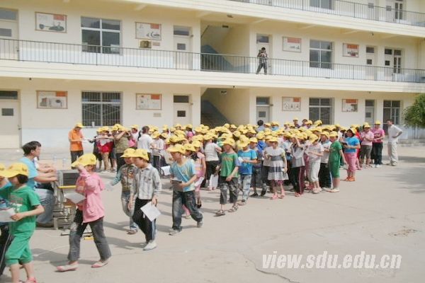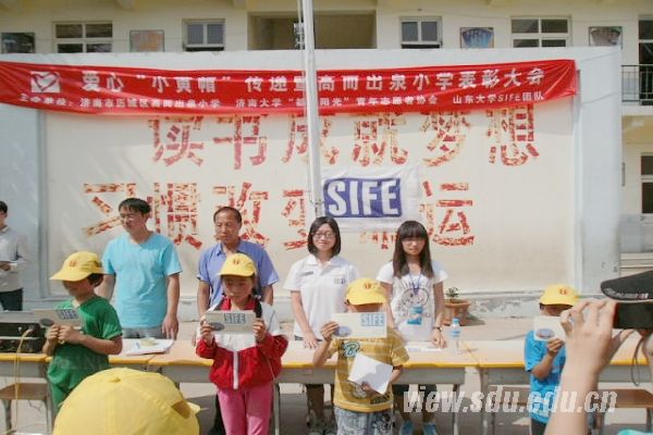 活动伊始,校长讲解了活动的目的,强调了交通安全的重要性。赛扶团队和济南大学的学生代表发言后,志愿者为小学生们戴上小黄帽。孩子们宣读交通安全词的声音虽稚嫩,神情却认真而严肃。志愿者们还为学生准备了各种奖励。优秀学生在掌声中走上台,由志愿者为他们颁发“山大赛扶爱心励志奖学金”;本学期成绩进步的学生也得到了学习用品,鼓励他们再接再厉。活动的最后,志愿者送给孩子们精心准备的心形折纸,并附上联系方式希望建立起长期的交流和帮扶关系,更多地关心帮助这里的孩子们。