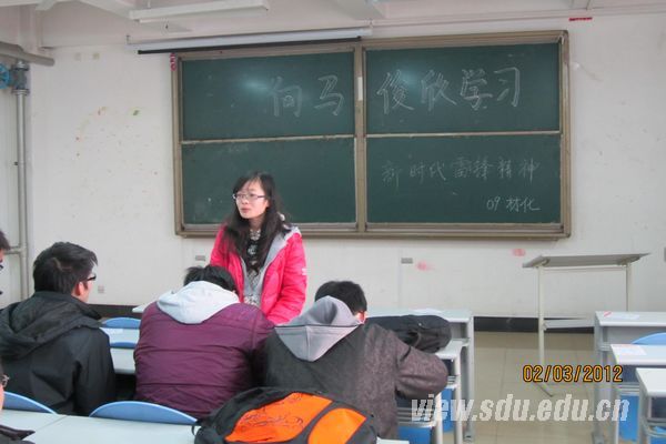 材料学院2011级6班、2010级4班、2009级材料化学班等班级纷纷举行主题班团会和交流会,向以山东大学杰出校友马俊欣为代表的新时期各行业雷锋式先进榜样学习。各班围绕“什么是新时代的雷锋精神”这一话题展开讨论,通过观看视频、幻灯片等方式了解马俊欣校友的感人事迹。同学们均被马俊欣校友“严于律己,恪尽职守,爱岗敬业,甘于奉献”的精神所感动,并表示将以马俊欣校友为榜样争做合格的山大人。同时,许多同学自发地在校园内发放传单,宣传马俊欣校友的事迹,号召同学们认真学习马俊欣校友的雷锋精神。