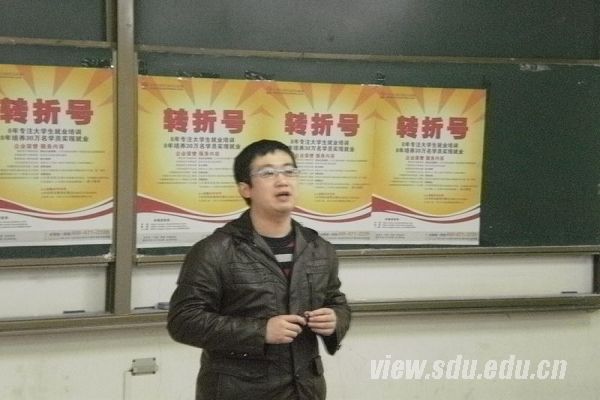 [本站讯]3月3日,转折号(中国)教育校园宣讲会在兴隆山校区举行。转折号(中国)教育市场部经理于洋主持会议,转折号(中国)教育集团金牌讲师陈浩现场为山大学子提供了就业分析和指导。