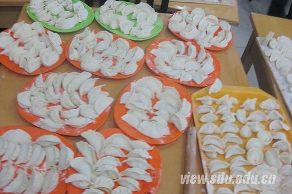 活动开始之前,同学们以“年级搭配、男女搭配”的抽签方式分为8个小组,有特色的抽签活动立刻将活动气氛调动了起来。随后,各小组领到了面粉、面团、饺子馅等食材和面板、擀面杖等用具。包饺子时,各小组有条不紊,分工明确,有的同学擀饺子皮,有的同学包饺子,很多南方同学从来没有包过饺子,所以决心趁这次机会好好学习一下。四十分钟之后各组基本完成任务,大家包出的饺子可谓五花八门、形状各异,有的很别致,有的则略显笨拙,浓浓的温情都包含在小小的饺子中。在饺子下锅的空当,2011级张梦晗同学为大家表演了男生小独唱《when I see you smile》,2010级王金阳和赵益超同学表演了小品《耍大牌》。在同学们热切的期待下,煮熟的饺子终于端上了桌,同学们的喜悦之情溢于言表。津津有味地吃完饺子之后,活动也进入了最后的游戏互动阶段。同学们兴致勃勃地玩起“萝卜蹲”、“同舟共济”、“杯水传情”等游戏,活动在一片欢声笑语中落下帷幕。