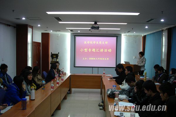[本站讯]12月12日,医学院2008级临床医学七年制学生党支部举办小型专题汇讲活动。该党支部全体党员、重点培养对象、学院低年级辅导员以及其他学生党支部党员代表60余人参加了活动。