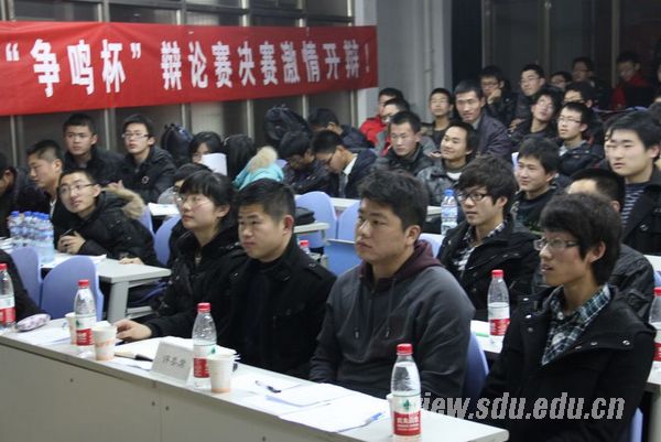机械学院辅导员老师陈诚、王忠山和学生会新一届主席团成员担任评委,机械学院大一学生到场观看了比赛。在冠军总决赛前,工业设计辩论队和机电第二辩论队围绕“机械学院里男生与女生谁更痛苦?”的辩题为同学们献上了一场精彩的辩论表演赛。虽说是一场表演赛,但经过细心准备的正反双方各持己见,你来我往,互不相让,迅速活跃了现场的气氛。随后,一路过关斩将晋级决赛的工业工程队和机电一队两支辩论队,为争夺最后的冠军展开了辩论。正方工业工程队抽到辩题为“人的自我实现过程重于结果”,反方机电一队则相应坚持“人的自我实现结果重于过程”的观点。