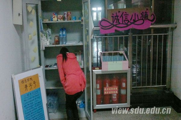 诚信小铺是在信息学院党委副书记赵世民提议和号召下筹建的,旨在提高山大学生的诚信品质。店铺成立之初进行了管理单位竞标,2011级光信二班最终竞标成功,由其班委统一负责管理。走近“诚信小铺”,醒目的“井字号小铺使用说明”映入眼帘,店铺中有超市中常见的饮料、文具、食品、书本等生活学习用品,为学生购物提供了极大方便。小铺旁设有投币箱,依靠学生自觉投币。小铺柜子上,贴满了学生们的留言便签,体现了学生对此次活动的支持。小铺每天公布诚信满意度,由此带动同学们提高自己的诚实品质。