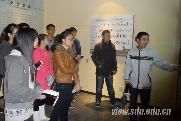 山东大学新博物馆位于中心校区知新楼A座27层,以考古学系的文物标本为主要展示内容,分为考古发现、考古地址、考古获奖和考古设备等部分。同学们在2009级考古班班长马永超的解说引导下,对博物馆进行了全面参观。参观过程中,马永超耐心地为同学们解释每件藏品的名字、由来等基本信息,作为博物馆解说员的李晓哲和王清涵也为大家解答了很多疑惑。通过此次参观,同学们深刻地感受了传统文化的精神魅力和高校博物馆的教化意义。