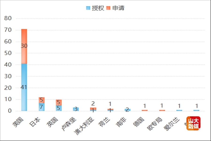 海外已公开专利129件,涉及主要国家和地区受理局包括:美国专利71件(41件已授权)、日本专利12件(7件已授权)、英国专利10件(5件已授权)、卢森堡专利3件(均已授权)、澳大利亚专利3件(1件已授权)、荷兰专利2件(1件已授权)、德国专利1件、欧专局专利1件、爱尔兰专利1件(该专利为实用新型,已授权)、韩国专利1件(已授权)。