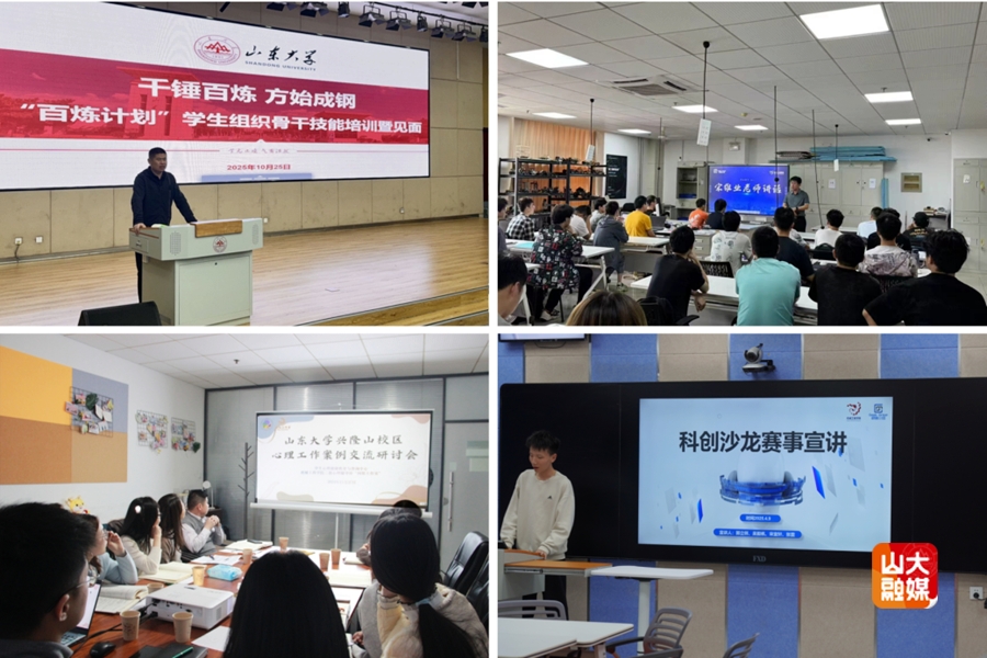 聚力赋能,师生协同醇化学风生态。学院师生协同赋能学风建设,联动“三支队伍”凝聚育人合力:建立学院学业辅导站,班主任依托交流平台分享经验,定期开展学风建设主题班会,搭建师生共进桥梁;辅导员严格落实“进课堂”制度,做好管理服务保障;学业导师提供科研创新指导与学业规划建议,助力学生全面成长;学院开设“成才大讲堂”系列活动,邀请优秀高年级学生传经送宝,厚植“以老带新”良好氛围;开展学生组织培训,引导学生在工作实践中学习实践本领、增进互助友谊、拓展学习范畴;班级自发建设“学习资源共享云盘”,搭建共同学习交流渠道;学院还积极开展心理委员培训会,呵护每一位学生“学在山大、快乐成长”。