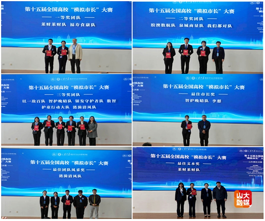 经过激烈角逐,山东大学的“莱财莱财”团队、“福寿食康”团队获得一等奖;青岛大学的“胶澳数航”等3支团队获得二等奖;青岛大学的“以一敌百”等5支团队获得三等奖;“莱财莱财”团队获得最佳文本奖;“涟漪清风”团队获得最佳团队风采奖;“智护晚情”团队的李想同学获得最佳市长奖。