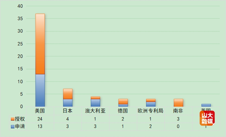 海外已公开专利62件,涉及主要国家和地区受理局包括:美国专利37件(24件已授权)、日本专利7件(4件已授权)、澳大利亚专利4件(1件已授权)、德国专利3件(2件已授权)、欧专局专利3件(1件已授权)、南非专利3件(均已授权)、英国专利1件(未授权)。