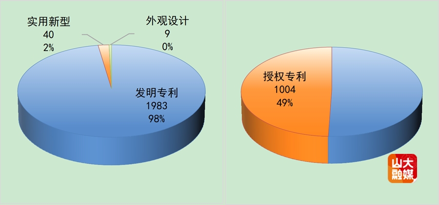 专利公开类型和授权专利数量如下图所示,公开类型以发明专利为主,有1983件(其中已授权发明专利955件),实用新型40件,外观设计9件。上述公开(公告)专利中授权专利有1004件,占2025年第三季度山东大学全部公开(公告)专利的49%。