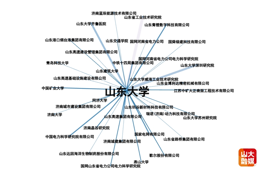 与山东大学合作较多的企业有山东高速集团有限公司(9件)、国家电网有限公司(8件)、山东青橙数字科技有限公司(8件),合作较多的院校包括山东省工业技术研究院(17件)、山东大学威海工业技术研究院(14件)、山东大学深圳研究院(13件)等。