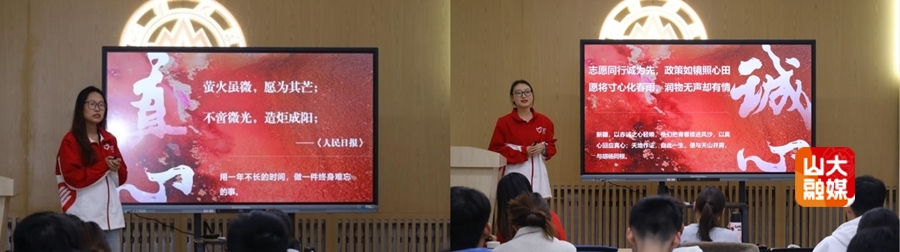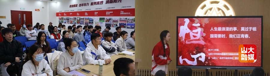 山东大学第27届研究生支教团新疆队成员林子郁、孙雯萍、徐小茹重返母校,结合在伊宁县支教服务经历对西部计划政策进行宣介,点燃青年赴疆建功的青春热情。三位同学依次从政策解读、实践感悟、发展机遇三个维度展开分享,详细介绍西部计划作为国务院批准的“高校毕业生基层培养计划”子项目的政策优势,解读服务期间的生活补贴、住宿保障、社会保险等基础支持,讲述与当地学生、村民结下深厚情谊的感人故事,描绘扎根西部的广阔前景,并为同学们答疑解惑。