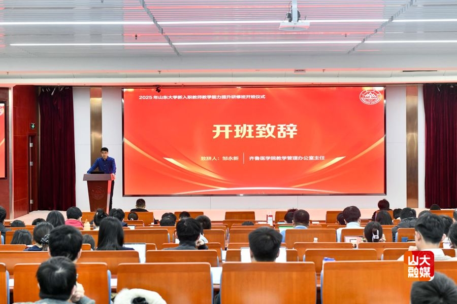 齐鲁医学院教学管理办公室主任邹永新为开班仪式致辞。他结合当前高校教育教学发展形势和自身教学成长的经历,阐明了新入职教师提升课堂教学水平与课程建设能力的重要意义,鼓励大家深耕教学,快速成长为站稳站好讲台的教育工作者。外国语学院教授、国家级教学名师王俊菊以“Teaching is a Win-Win Journey”为主题分享了教师教学成长经验智慧。她从教学理念革新、教师角色定位、教学方法优化、教学能力进阶等方面系统说明了高校教师应具备的成长思维与路径,助力大家找准教学发力方向。控制科学与工程学院教授郭帅帅以“青年教师的AI教学探索”为主题作分享,聚焦新时代教育发展趋势与AI技术浪潮,通过真实案例解读未来课堂的创新形态,展现科技与教育融合的无限可能,为教师探索高效课堂模式提供全新思路。教学促进与教师发展中心副研究员朱征军以“为了更好的‘我们’”为题介绍了本期研修班背景情况,解读了研修班的学习目标、学习内容模块、学习模式、实施流程及考评要求等。