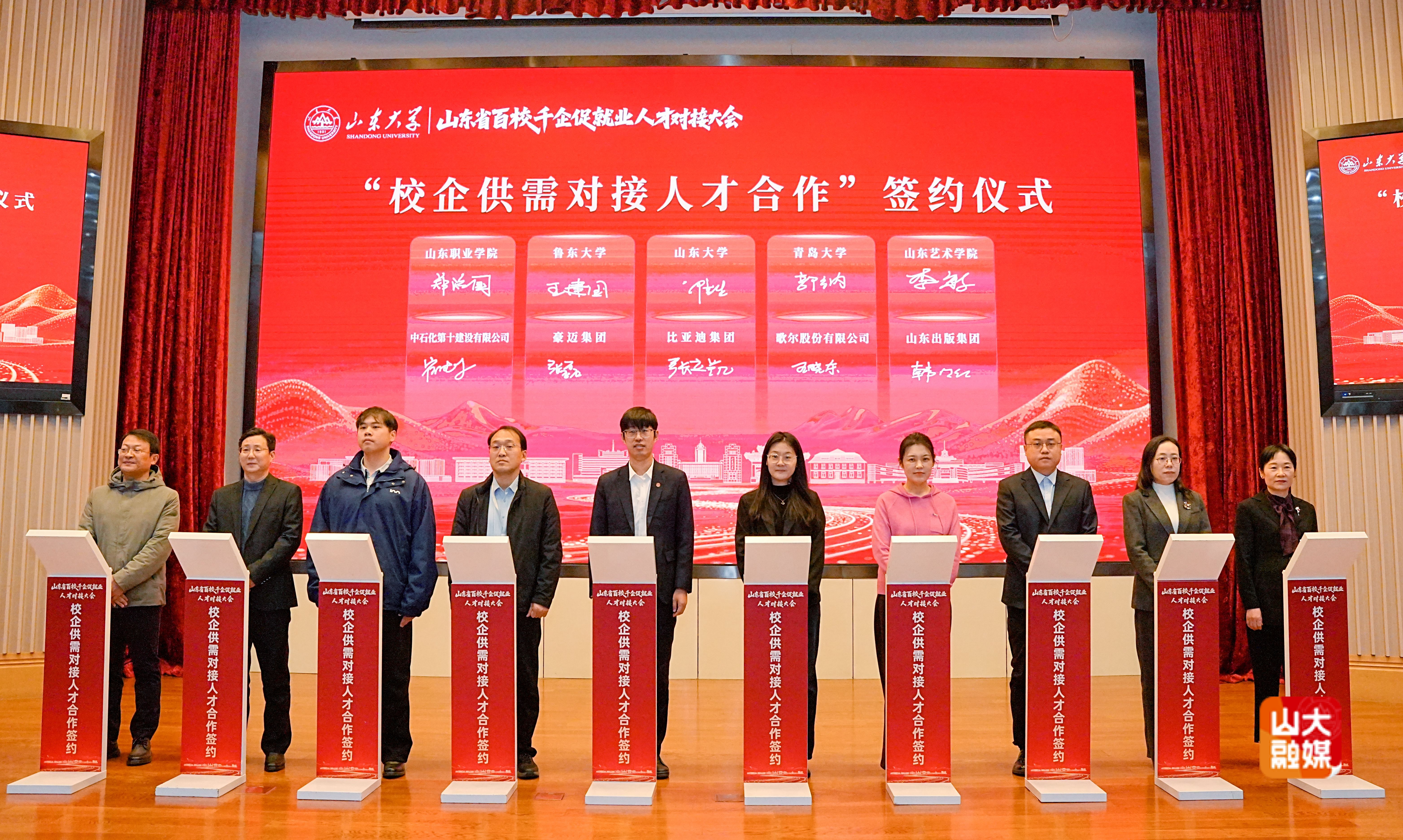 与会领导共同启动对接大会。山东大学、青岛大学、鲁东大学、山东艺术学院、山东职业学院等5所高校,与比亚迪集团、歌尔股份有限公司、豪迈集团、山东出版集团、中石化第十建设有限公司等企业进行校企合作签约,在人才培养、实习实训、求职招聘方面深化合作,推动产学研深度融合。济南市人力资源和社会保障局党组成员、副局长朱卫华推介了济南市产业引才环境。