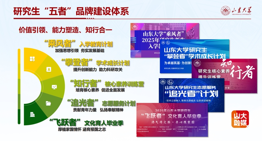 “知行者”研究生核心素养提升训练营是学校于2021年启动的研究生思想政治育人品牌,由研究生院、党委研究生工作部主办,研究生团工委协办。包括党建引领、创赛创新、校园文化、安全教育、就业指导等研究生思想政治工作关键内容。品牌紧扣文化基础、自主发展、社会参与三大框架,着力提升人文底蕴、科学精神、学会学习、健康生活、责任担当、实践创新六类核心素养能力。自创立以来,已累计开展活动80期,直接服务研究生数万人次,是山东大学研究生思想政治教育“五者”品牌之一,也是学校研究生思想政治工作体制机制下沉的代表平台,可开放给培养单位申报,校院联动实施。品牌建设将继续坚持“知行合一”的建设理念,强化教育链、人才链与创新链的有机衔接,为培养具有家国情怀、全球视野、创新精神与实践能力的“最具创造力的研究生”提供坚实保障。