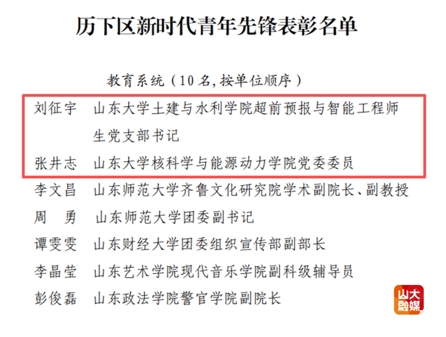 [本站讯]近日,中共济南市历下区委、区政府印发表彰决定,授予100名同志“历下区新时代青年先锋个人”称号,其中含教育系统10人。山东大学土建与水利学院刘征宇、核科学与能源动力学院张井志两位青年教师获评,彰显了学校青年人才服务国家战略、助力地方发展的先锋担当和昂扬进取、脚踏实地的青年风貌。