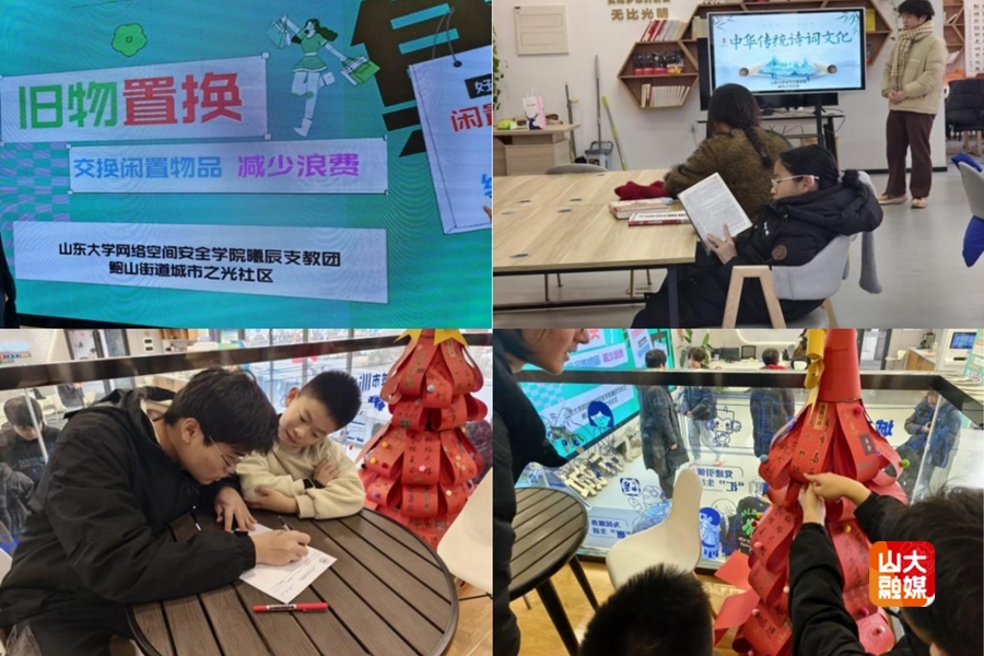 在本次寒假社会实践中,学院共组织14支支教调研团队深入山东、河南、浙江等地开展网络安全科普宣传、科学知识讲授等支教工作,同时结合不同地区发展特色,打造了一系列兼具趣味性、教育性的实践活动。“曦辰支教团”扎根鲍山街道城市之光社区,大力开展垃圾分类和旧物置换的知识宣传与科普,同时和社区“未成年保护中心”的孩子们一起写福字、剪窗花,让浓浓的年味浸润邻里。“启明”支教团联动电气工程学院开展中华优秀传统文化体验课程,通过诗词品读、经典赏析等形式,为多个社区搭建传统文化学习平台。