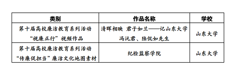 [本站讯]近日,教育部公布第十届高校廉洁教育系列活动评选结果,山东大学获佳绩。其中,《清晖相映 君子如兰——记山东大学冯沅君、陆侃如先生》入选“视廉正行”视频作品单元,山东大学纪检监察学院入选“传廉促担当”廉洁文化地图素材教育基地。