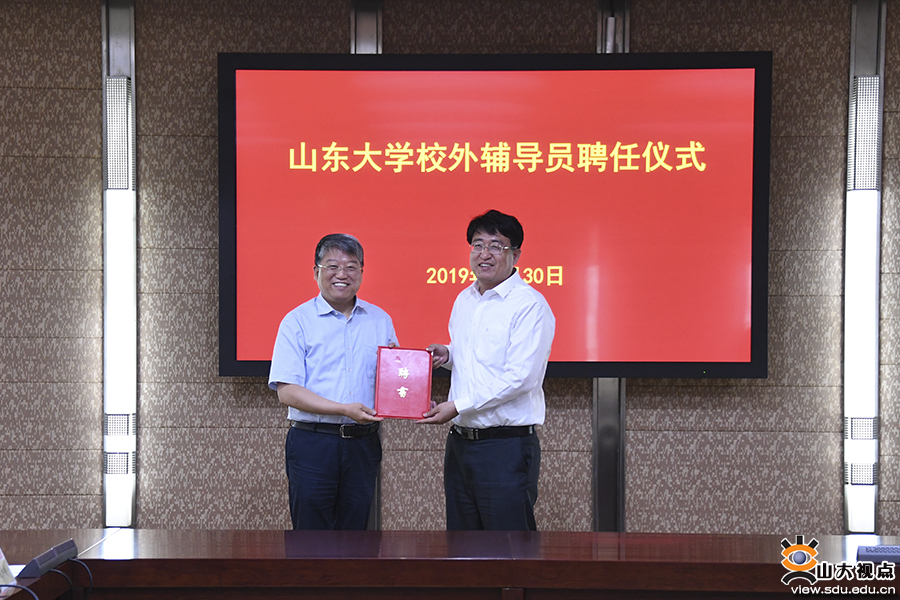 报告会前,校企双方进行了座谈交流。郭新立和葛红林分别对山东大学和中铝集团的基本情况作了介绍。郭新立为中铝集团推荐的两位校外辅导员颁发聘书,他们分别是山东铝业职业学院党委书记杜树宇和全国劳模徐鸿。中铝集团工会、党群工作部,山东铝业有限公司党委工作部等相关单位负责人;山东大学党办校办、学工部、服务山东办等相关部门负责人参加活动。