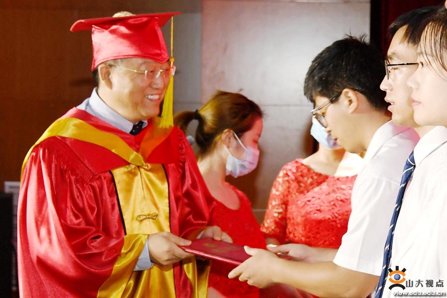 典礼环节,常务副校长王琪珑宣读了《山东大学关于表彰2020届优秀毕业生的决定》。校党委书记郭新立为获奖代表颁发证书并合影。