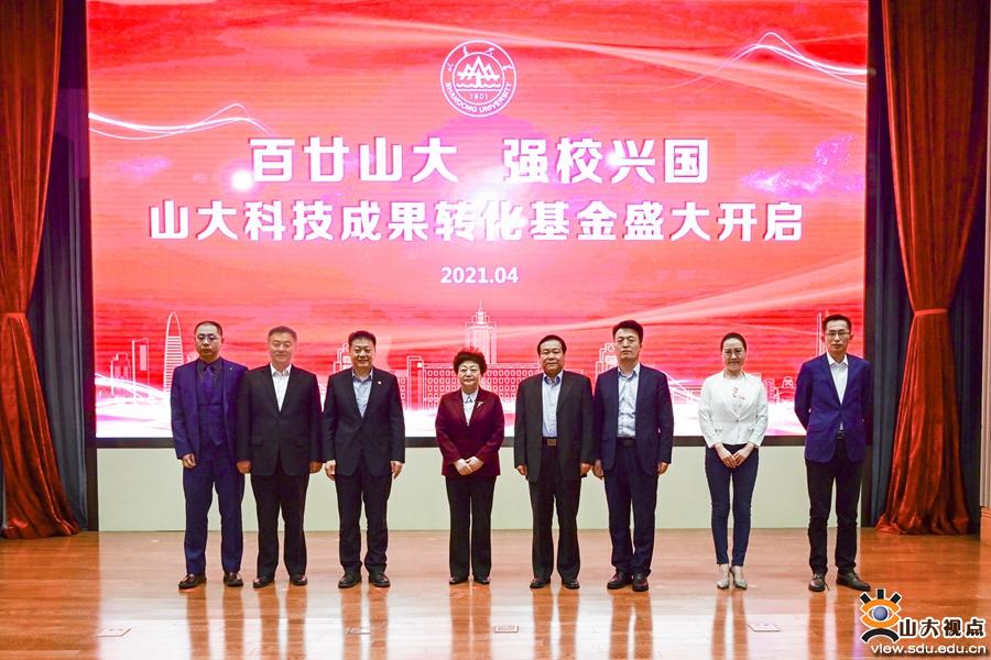 会上举行了山东大学科技成果转化基金启动仪式。今年是山东大学建校120周年,学校倡议发起设立山东大学科技成果转化基金,得到山东财金、济南财投、山东人才发展集团、山东产研院、山东工研院、高新财金、华特控股、济南胜悦等单位的大力支持,联合发起设立山大科技成果转化基金,基金总规模四至五亿元,专项支持学校科技成果转化和“山大系”科技创新。