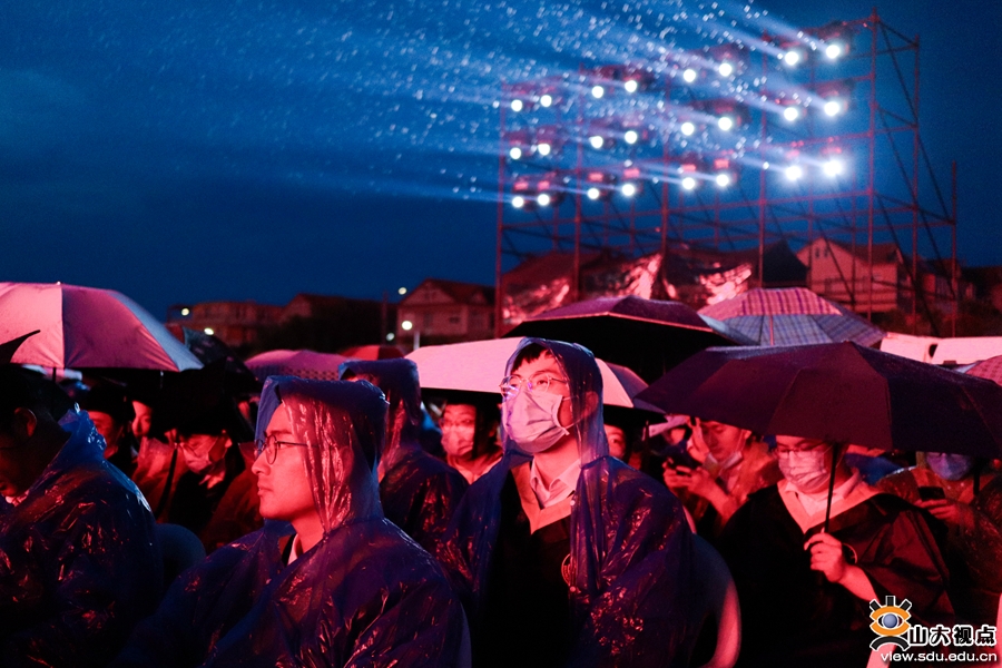 典礼和学位授予仪式的间隙,青岛校区大学生艺术团、十大歌手及毕业生代表演唱歌曲《不说再见》和《昨日青空》。鳌山湾畔,骊歌回响,欢声飘荡,淅沥的小雨无法阻挡同学们的热情,大家欢呼、鼓掌,舞动的闪光灯仿佛点点星光,照亮这离别的夜晚。