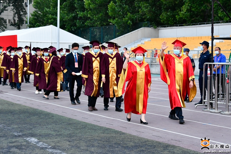 典礼前的序典环节,暖场视频循环播放,唤醒毕业生与山大的独家记忆。主题MV《领航》唱响山大人情系家国天下、矢志复兴伟业的初心情怀;抗疫主题视频《归去来》带领大家回到了那段转运隔离时期守望相助、共克时艰的日子;歌曲《山大人》将同学们的思绪拉回百廿校庆的盛大时刻;宣传片《百廿山大 强校兴国》回顾一代代山大人筚路蓝缕、奋楫扬帆的历史进程;主题视频《缘起相知》中,校友们与山大的灵魂相依,让大家感受到“凡我在处,便是山大”的温暖。随后,现场播放了毕业纪念视频《明日即长路》,视频中一幕幕熟悉的场景闪过,入学、军训、上课、实验、运动、社会实践、转运隔离……一桩桩、一件件,将毕业生带回那段难忘的青葱岁月;师长的殷殷嘱托让毕业生坚定了勇担时代重任的广博志向;“心中有爱,眼中有光”“但行好事,莫问前程”,毕业生们随着视频中的熟悉画面最后一次驻足。在视频的终章“遥望”,一曲《陪你度过漫长岁月》以快闪的形式亮相,学者、教工、辅导员代表与毕业生同学一道,引吭高歌,将现场气氛推向高潮。山大与毕业生的相互陪伴,便是彼此间最长情的告白。现场毕业生眼含泪水,挥动着手中“山大,我爱你”的旗子,一起动情合唱。
