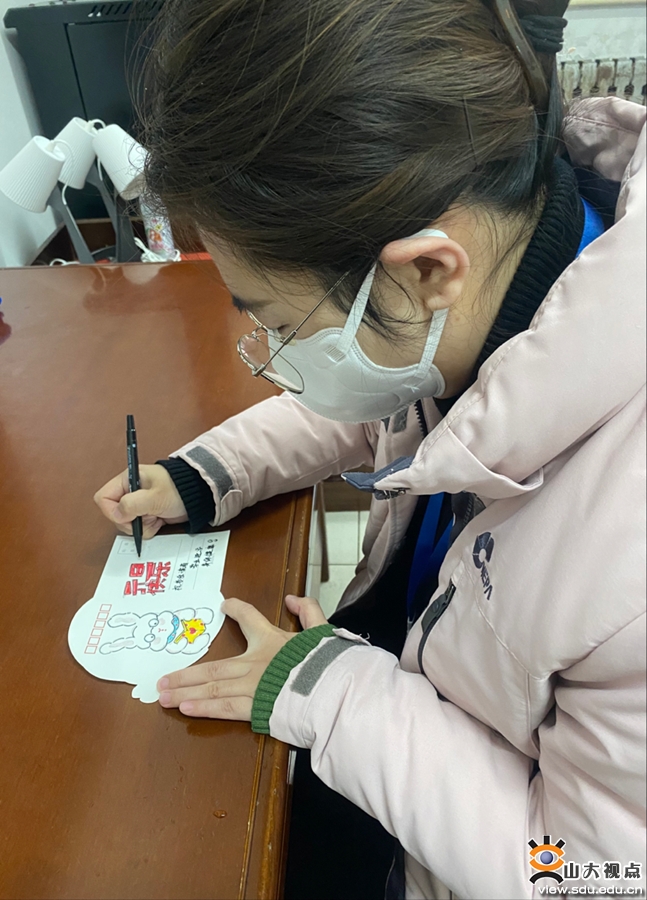 新年第一天,洪家楼校区图书馆馆员刘瑶和同事们正在为读者绘制祝福卡片,将对读者的新年祝福浓缩在一张张小小的卡片上,送至元旦来馆读者手中。图书馆一直秉承“读者第一 服务至上”的宗旨,为每一位来馆读者送去热情周到的服务。在新的一年,祝愿各位读者心之所向,行之所往,图书馆永远是每位读者最温情的守候。