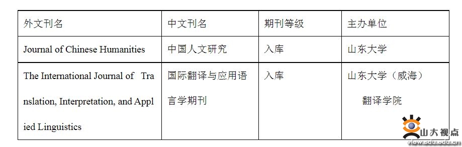 英文刊建设成效显著,两本期刊顺利入库。山东大学一向重视人文社科期刊国际化建设,不断探索山大特色的国际化办刊之路。在《中国人文社会科学期刊AMI综合评价报告(2022年)》中,收录有山东大学英文刊物2种,分别为Journal of Chinese Humanities(《中国人文研究》)和The International Journal of Translation, Interpretation, and Applied Linguistics(《国际翻译与应用语言学期刊》)。The International Journal of Translation, Interpretation, and Applied Linguistics为2019年由山东大学翻译学院专家主编、创刊,提升了山东大学翻译学院在翻译学及语言学领域的学术影响力。