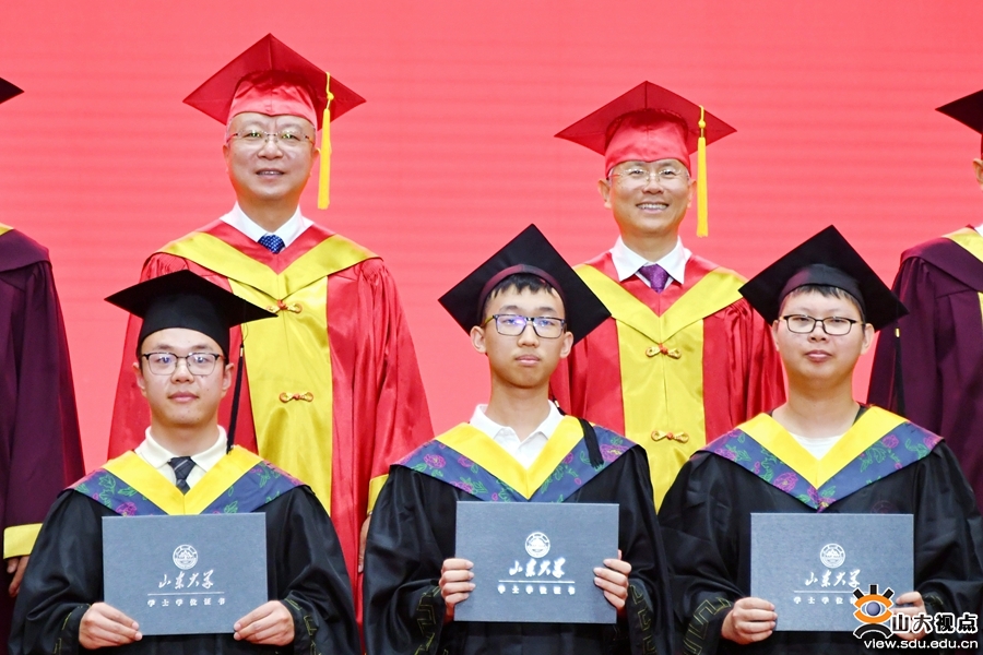 校领导、校学位评定委员会委员、专家学者代表集体为毕业生颁授学位证书。毕业生们依次上台,鞠躬行礼、接过证书、合影留念,一张张照片定格了他们与山大的独家记忆,成为圆满完成学业的难忘见证。