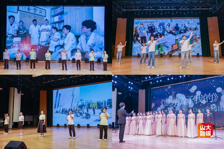 齐鲁医院(第一临床学院)同学们以一曲《强国一代有我在》激昂唱响新时代齐鲁医学人的心声;口腔医学院(口腔医院)师生温情演绎精心改编的《送你一朵小红花》,以艺术的柔光映射出医学实践中的仁爱温度;齐鲁医学堂2025级全体新生齐声高唱《少年中国说》,以磅礴气势宣告作为医学生的青春担当与锐气锋芒;Dr.Cats合唱团带来合唱《齐鲁大学校歌》《世界赠予我的》。