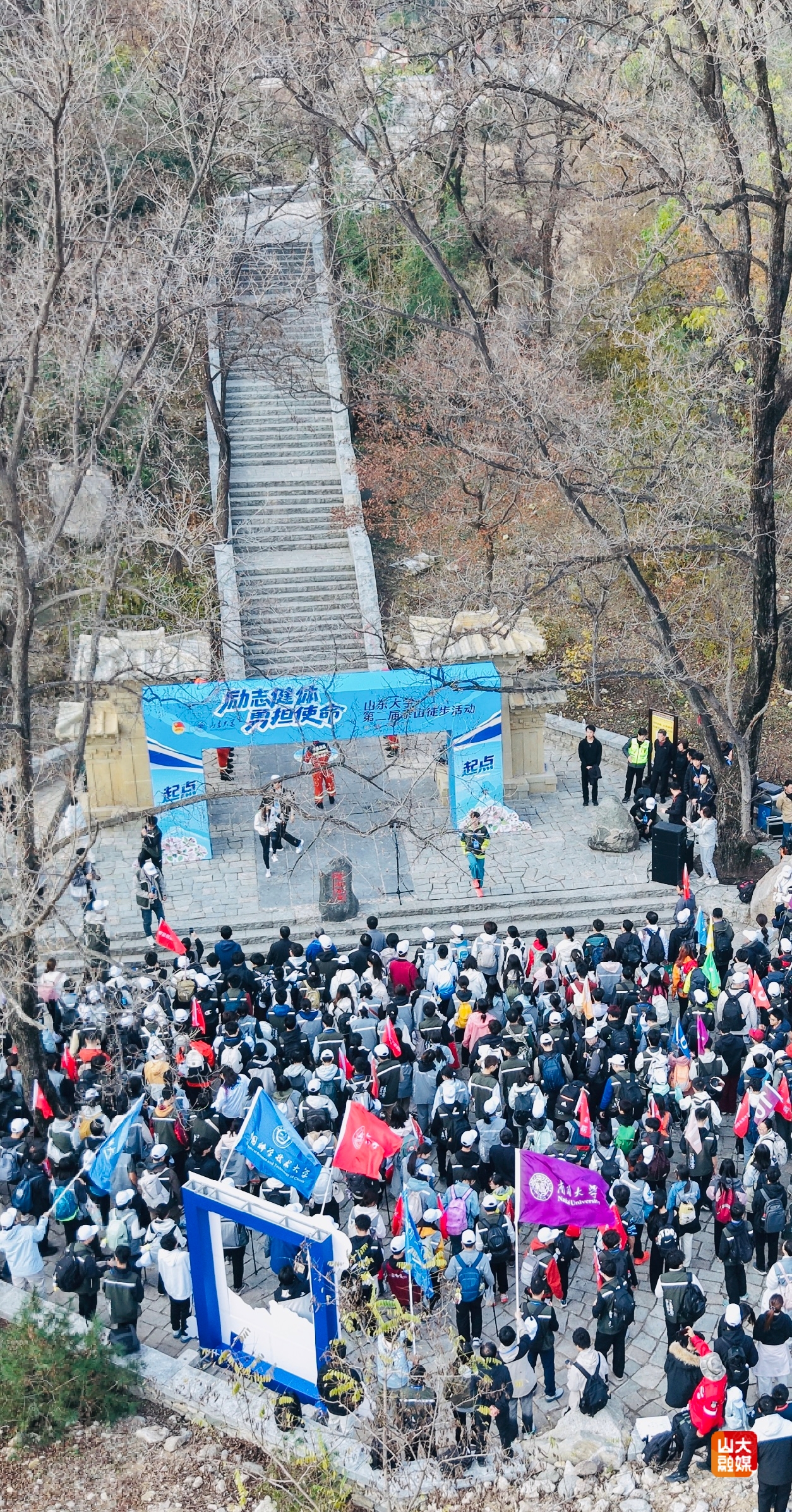[本站讯]11月16日上午9:00,山东大学第二届“励志健体,勇担使命”泰山徒步活动启动仪式在泰山东御道汉阙广场举行。山东大学校长李术才、泰山景区党工委书记孙磊致辞,师生代表发言。校党委副书记李向阳、校党委副书记张帅参加活动。