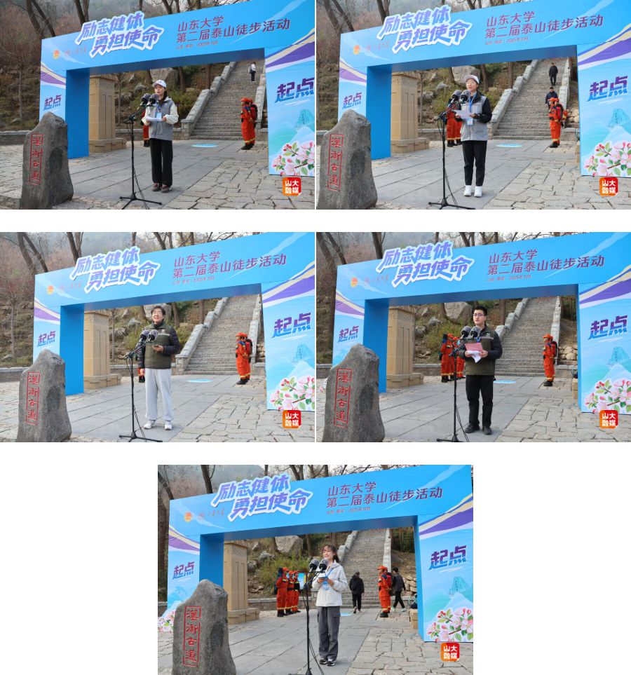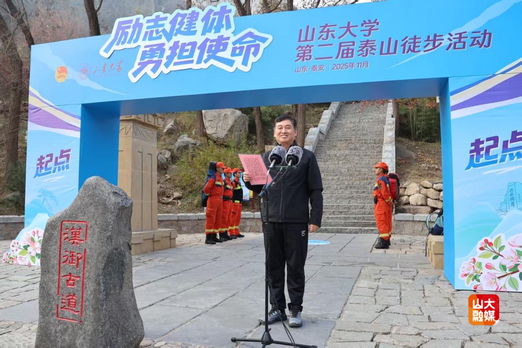 李术才在致辞中说,习近平总书记高度重视青少年体育工作,强调“少年强、青年强则中国强。少年强、青年强是多方面的,既包括思想品德、学习成绩、创新能力、动手能力,也包括身体健康、体魄强壮、体育精神。”124年来,山东大学不仅孕育卓越的学术与创新基因,也饱含坚韧不拔的体育精神。这场泰山之约,是健体励志的身心历练,是奋勇争先的精神淬炼,是登高望远的家国情怀塑造。愿同学们以此次徒步为起点,长存攀高之志,永葆奋进姿态,在跋山涉水中,锤炼百折不挠的坚韧意志,锻造乐观积极的平和心态,增益“自强不息”的文化基因,探寻“勇攀高峰”的精神密码,终身学习、终身锻炼、终身成长,练就担当作为的硬脊梁、铁肩膀、真本事,不断增强反弹力、耐力和坚毅力,不负时代,不负韶华,在推进中国式现代化的宽广舞台上绽放青春光彩、作出青春贡献!