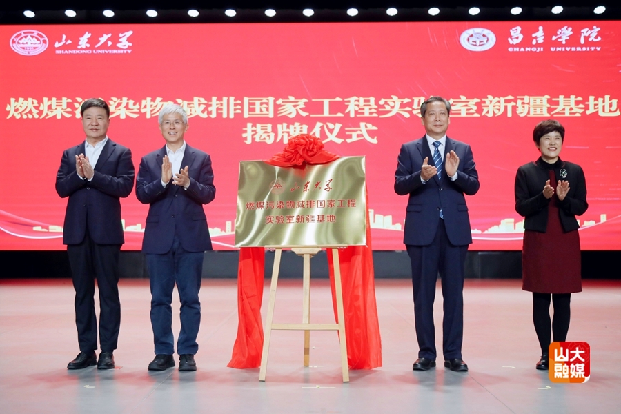 李术才、朱德建、罗旭、季荣共同为“山东大学燃煤污染物减排国家工程实验室新疆基地”揭牌。