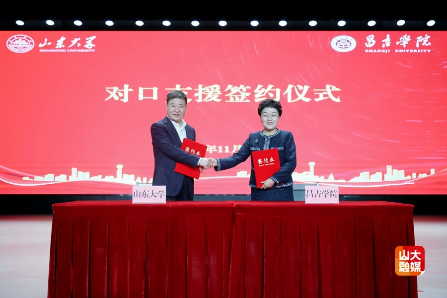 山东大学副校长朱德建与昌吉学院副校长杨莲红共同签署新一轮《山东大学昌吉学院对口支援框架协议》。