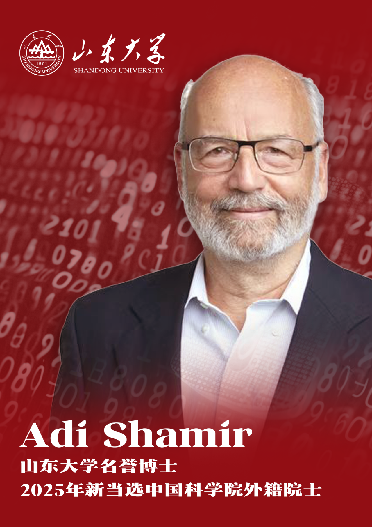 Adi Shamir,山东大学名誉博士、美国国家科学院院士、美国艺术与科学院院士、欧洲科学院院士、英国皇家学会外籍院士、法国科学院外籍院士、国际密码协会(IACR)会士、以色列魏茨曼科学研究所教授。Shamir教授在密码领域作出奠基性贡献,与Ron Rivest、Leonard Adleman共同设计的首个基于数学计算难题的公钥密码体制RSA,奠定了现代公钥密码学的设计理论根基,是密码学史上的革命性突破,荣获2002年图灵奖;开创了基于身份的密码原创理论,推动密码学从理论走向大规模实际应用;与Eli Biham共同提出差分分析方法,首次给出美国数据加密标准DES的理论攻击,这一里程碑方法成为对称密码分析学的基石。荣获2024年沃尔夫数学奖。