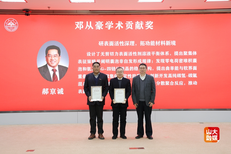 吴臻表示,山东大学化学学科历史悠久,始终聚焦国家重大战略需求和国际科学前沿,为推动基础研究创新、提升源头创新能力、促进经济社会高质量发展作出了山大贡献。邓从豪先生德高望重、成果卓著,将毕生心血奉献给祖国的科学和教育事业。期待在“邓从豪奖”的持续激励下,涌现出更多心怀“国之大者”、矢志科技报国的杰出人才,为加快教育强国、科技强国、人才强国建设注入磅礴动力,在新时代谱写科教兴国的壮丽华章。