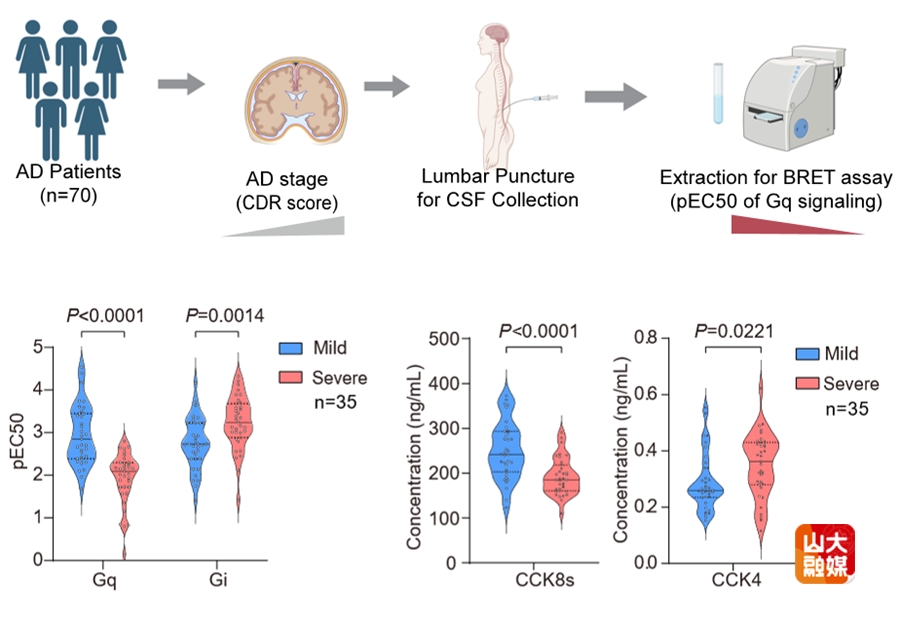 研究团队通过检测AD患者的脑脊液样本,发现CCKBR介导的Gq信号活性随AD病程进展逐渐降低,而Gi信号活性则呈上升趋势。同时发现,CCKBR下游的Gs或Gq信号通路激活可发挥神经保护作用,而Gi通路并不参与该过程。临床样本分析显示,AD严重程度与脑脊液中CCK8s水平下降及CCK4水平升高显著相关,提示CCKBR信号失衡可能在AD病理进程中起重要作用。综上,这些结果表明CCKBR下游Gq信号通路在AD病程中具有正向调控功能,靶向CCKBR-Gq信号轴有望为AD治疗提供新策略。